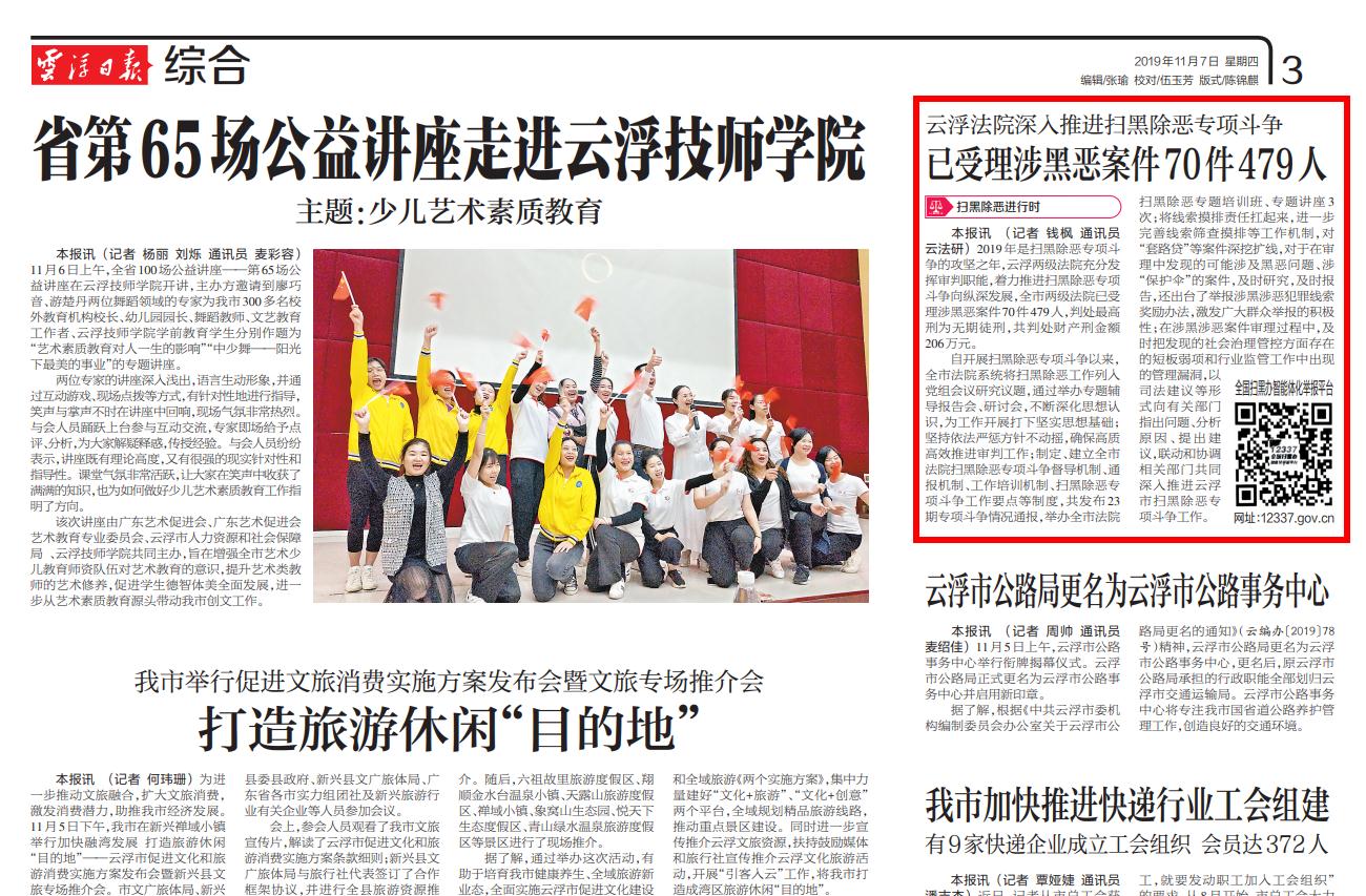 云浮日报:云浮法院深入推进扫黑除恶专项斗争 已受理涉黑恶案件70件479人