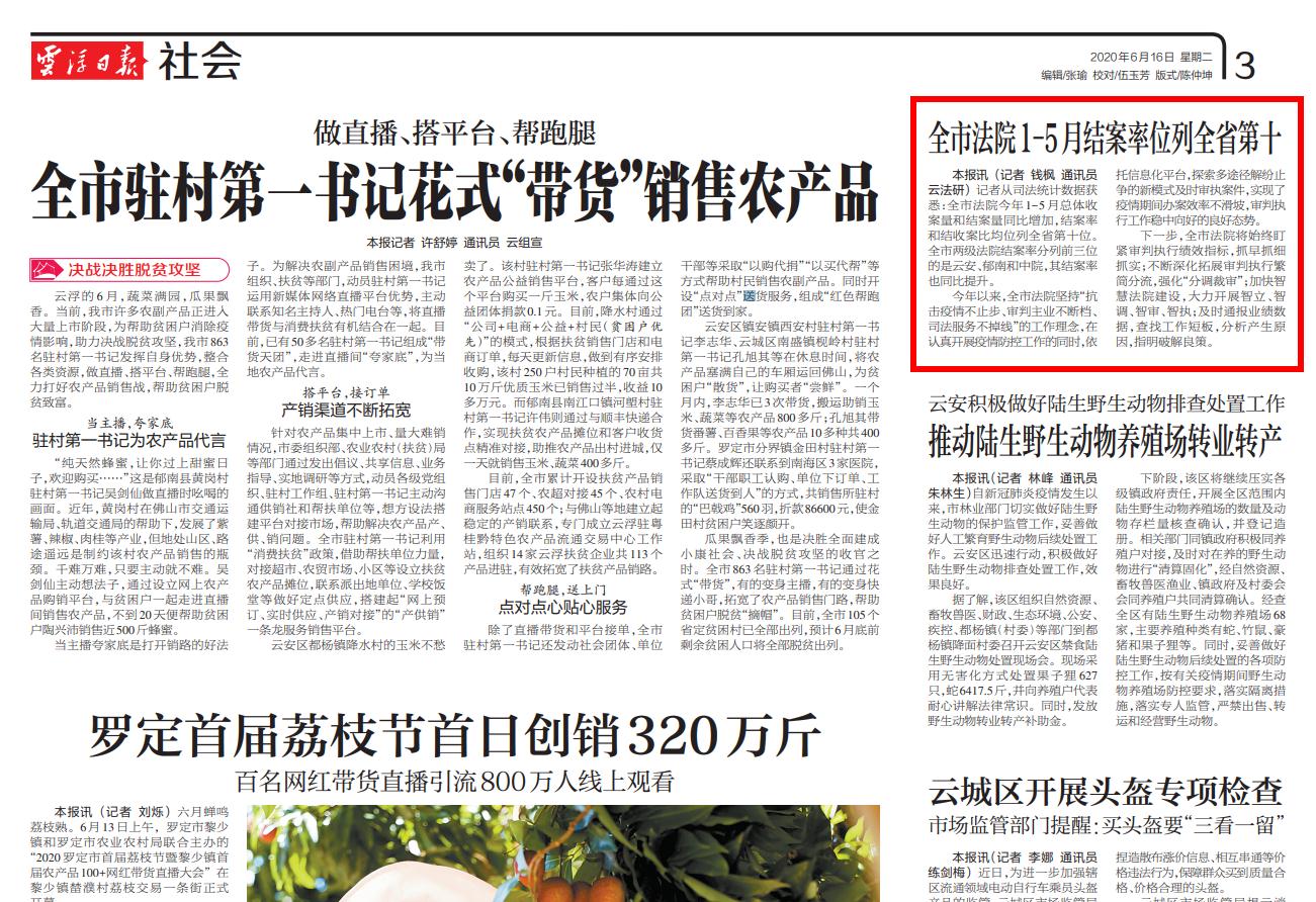 云浮日报:全市法院1-5月结案率位列全省第十