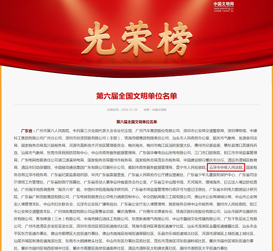 11月20日,中央文明委公布了第六届全国文明城市、文明村镇、文明单位和第二届全国文明家庭、文明校园及第六届全国未成年人思想道德建设工作先进城市(区)和第五届先进单位、先进工作者名单。云浮市中级人民法院,荣获第六届全国文明单位称号。
