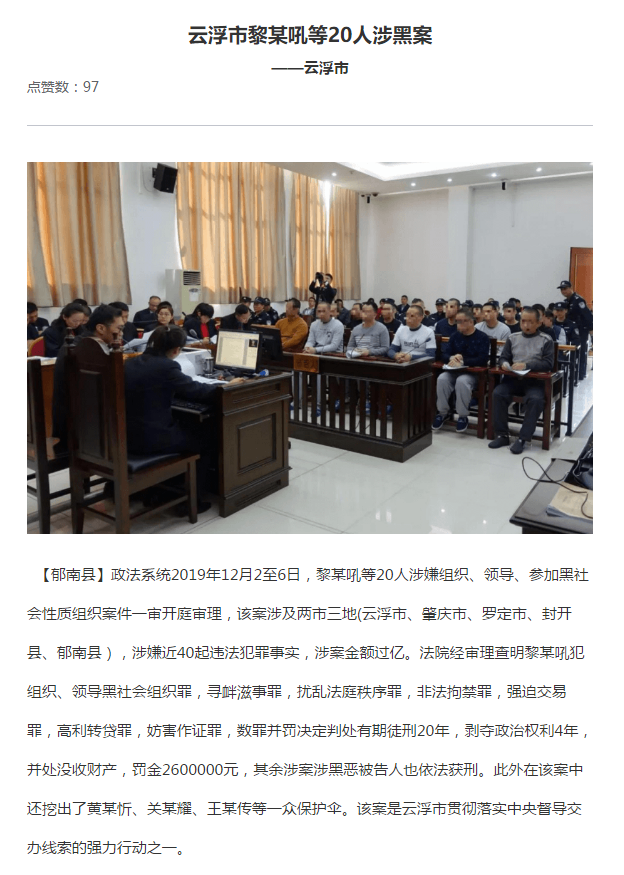 4月6日-13日“广东扫黑除恶十大典型案例”网上投票,中央扫黑除恶督导组交办云浮并判处20年有期徒刑、罚金260万元、涉案金额超过1亿元的黎某吼案进入候选。