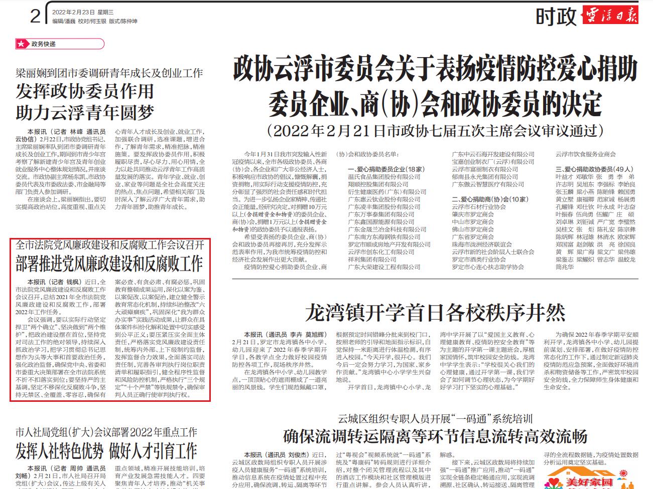 会议强调,要以实际行动坚定捍卫“两个确立”、坚决做到“两个维护”,把政治建设摆在首位,坚持党对司法工作的绝对领导,持续深入抓政治学习,把学习贯彻总书记思想作为头等大事和首要政治任务,强化政治监督,确保党中央、省委和市委重大决策部署在全市法院系统不折不扣落实到位;要坚持严的主基调,坚定不移深化反腐败斗争,坚持无禁区、全覆盖、零容忍,确保有案必查、有贪必肃、有腐必惩,巩固教育整顿成果运用,深化以案为鉴、以案促改、以案促治,建立健全警示教育常态化机制,持续纠治整改“六大顽瘴痼疾”,巩固深化“我为群众办实事”实践活动成果,让群众在具体案件纠纷化解和处置中切实感受到公平正义;要压紧压实全面主体责任,严格落实党风廉政建设责任制,统筹内外部、上下级制约监督,发挥监督合力效果,全面落实司法责任制,完善各审判执行岗位职责清单和履职指引,健全程序性监督和风险防控机制,严格执行“三个规定”“十个严禁”等铁规禁令,确保审判人员正确行使审判执行权。(《云浮日报》2月23日第2版)