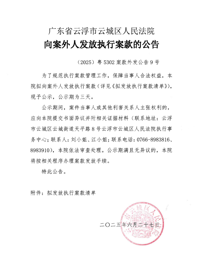 云浮市云城区人民法院向案外人发放执行案款的公告(2025)粤5302案款外发公告9号