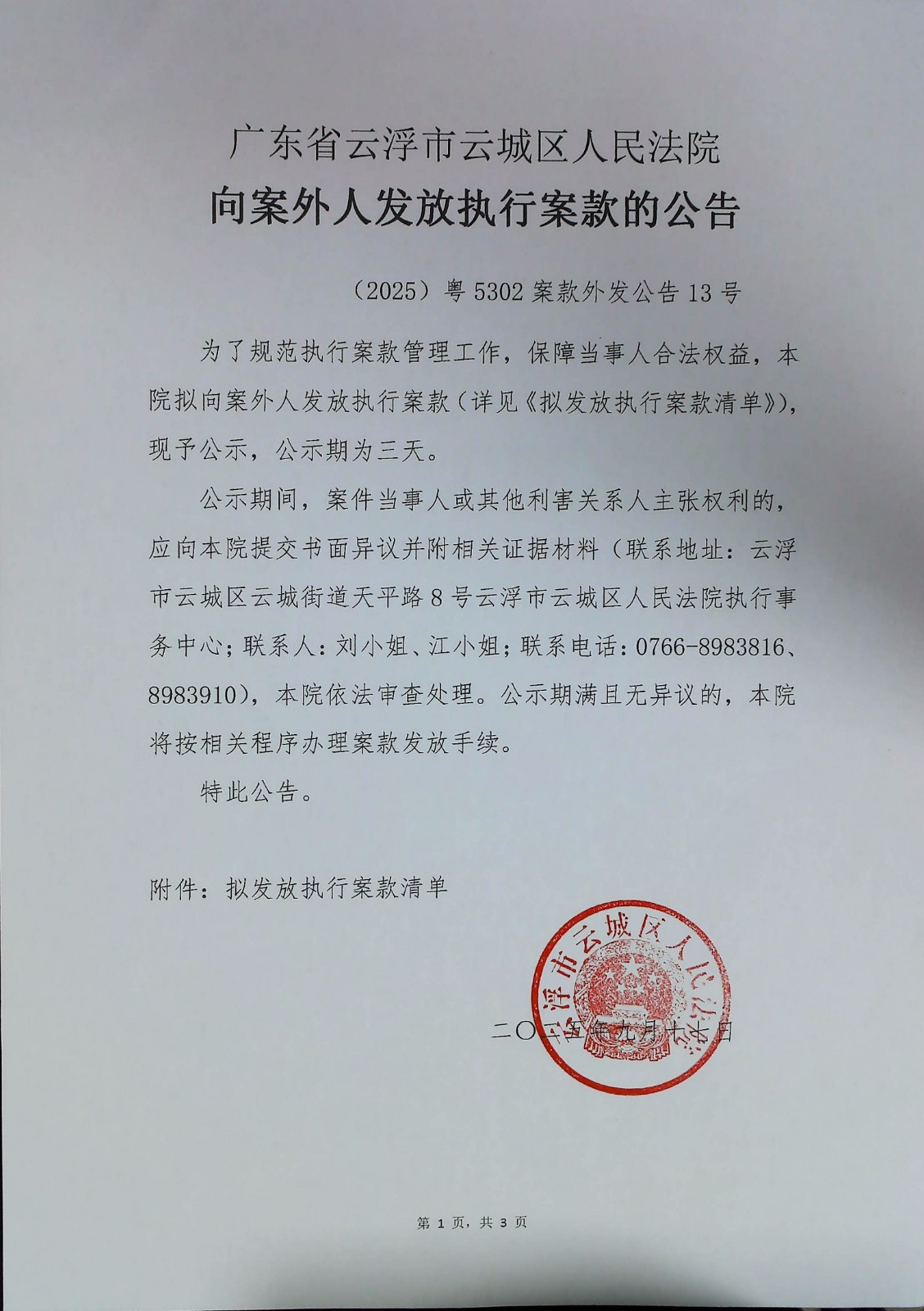 云浮市云城区人民法院向案外人发放执行案款的公告(2025)粤5302案款外发公告13号