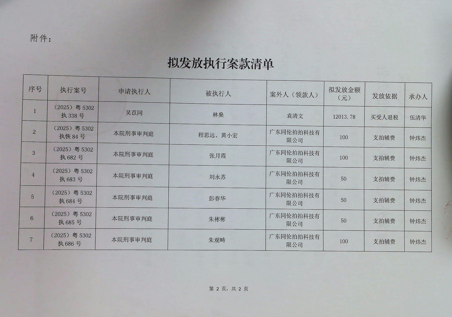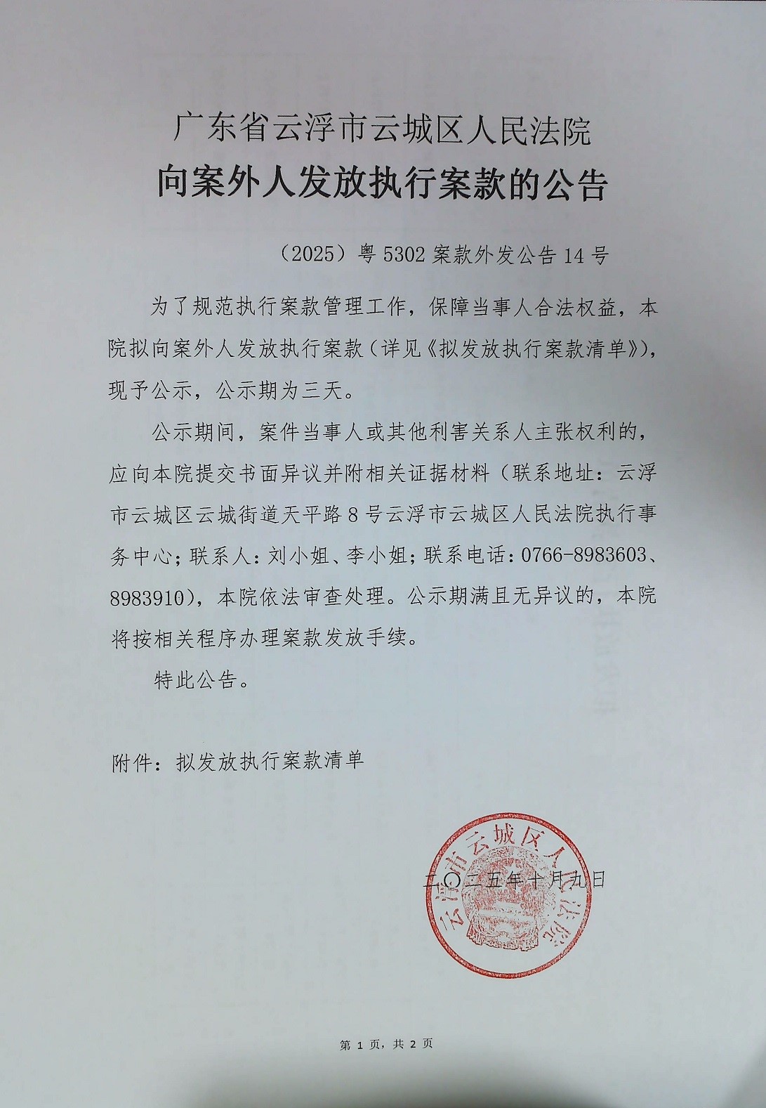 广东省云浮市云城区人民法院向案外人发放执行案款的公告 (2025)粤5302案款外发公告14号