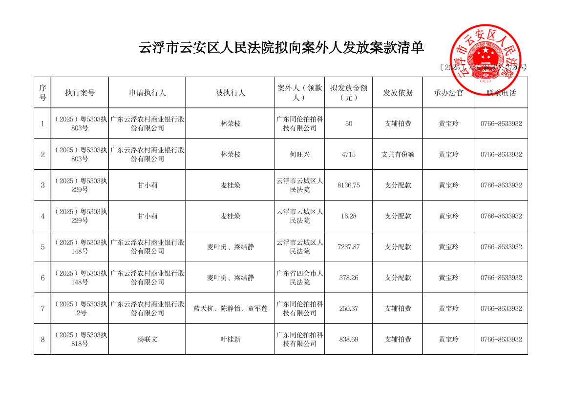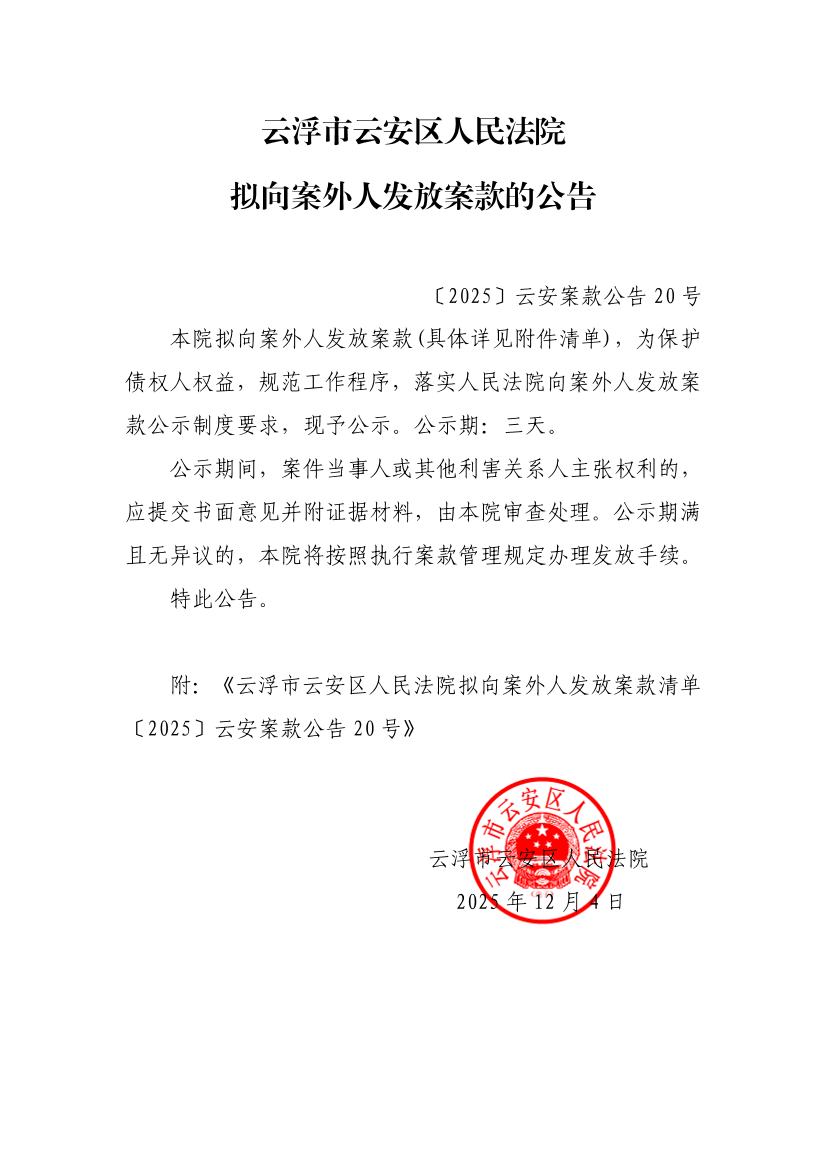 云浮市云安区人民法院拟向案外人发放案款的公告〔2025〕云安案款公告20号