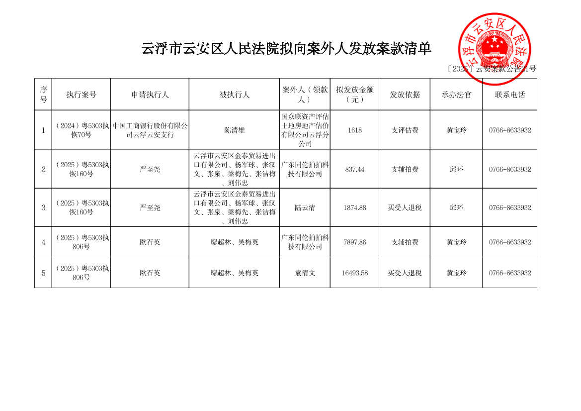 云浮市云安区人民法院拟向案外人发放案款的公告〔2025〕云安案款公告21号