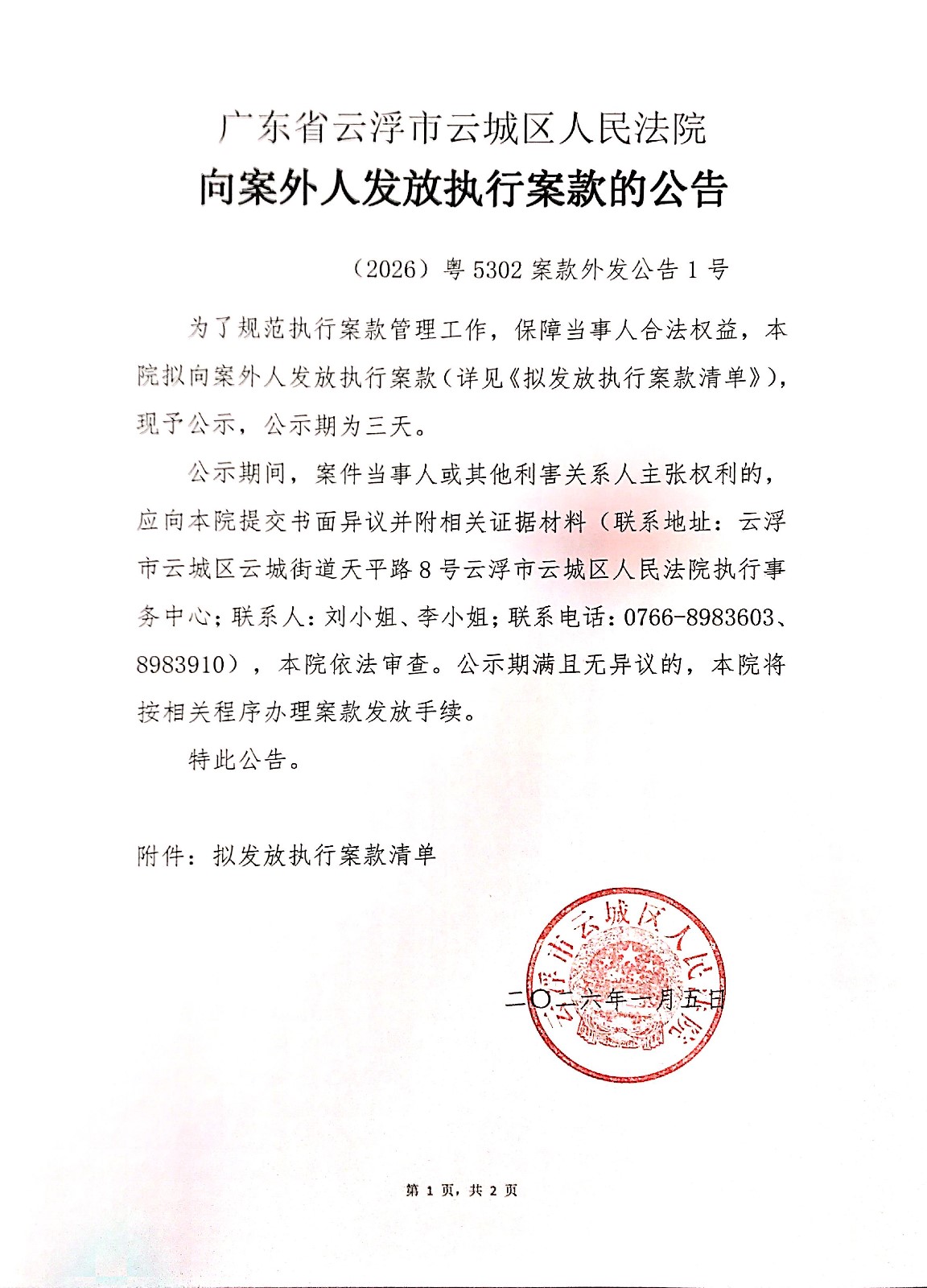 广东省云浮市云城区人民法院向案外人发放执行案款的公告(2026)粤5302案款外发公告1号