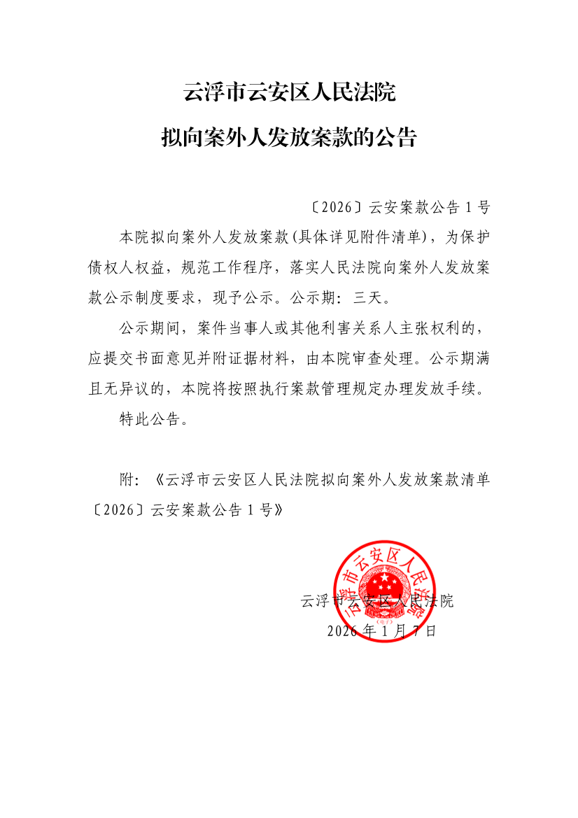 云浮市云安区人民法院拟向案外人发放案款的公告〔2026〕云安案款公告1号