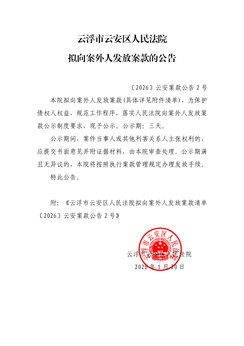 云浮市云安区人民法院拟向案外人发放案款的公告〔2026〕云安案款公告1号