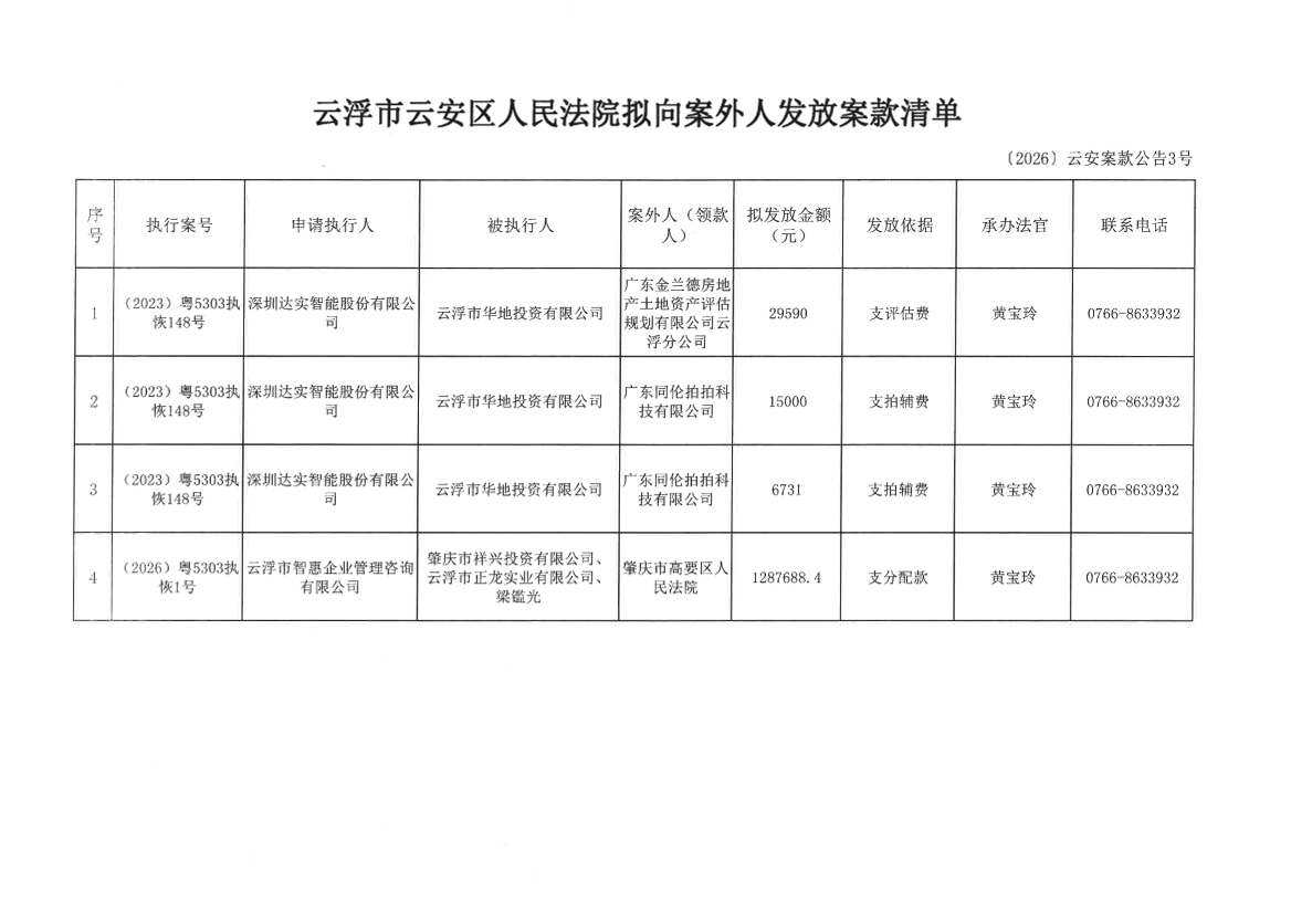 云浮市云安区人民法院拟向案外人发放案款的公告〔2026〕云安案款公告4号