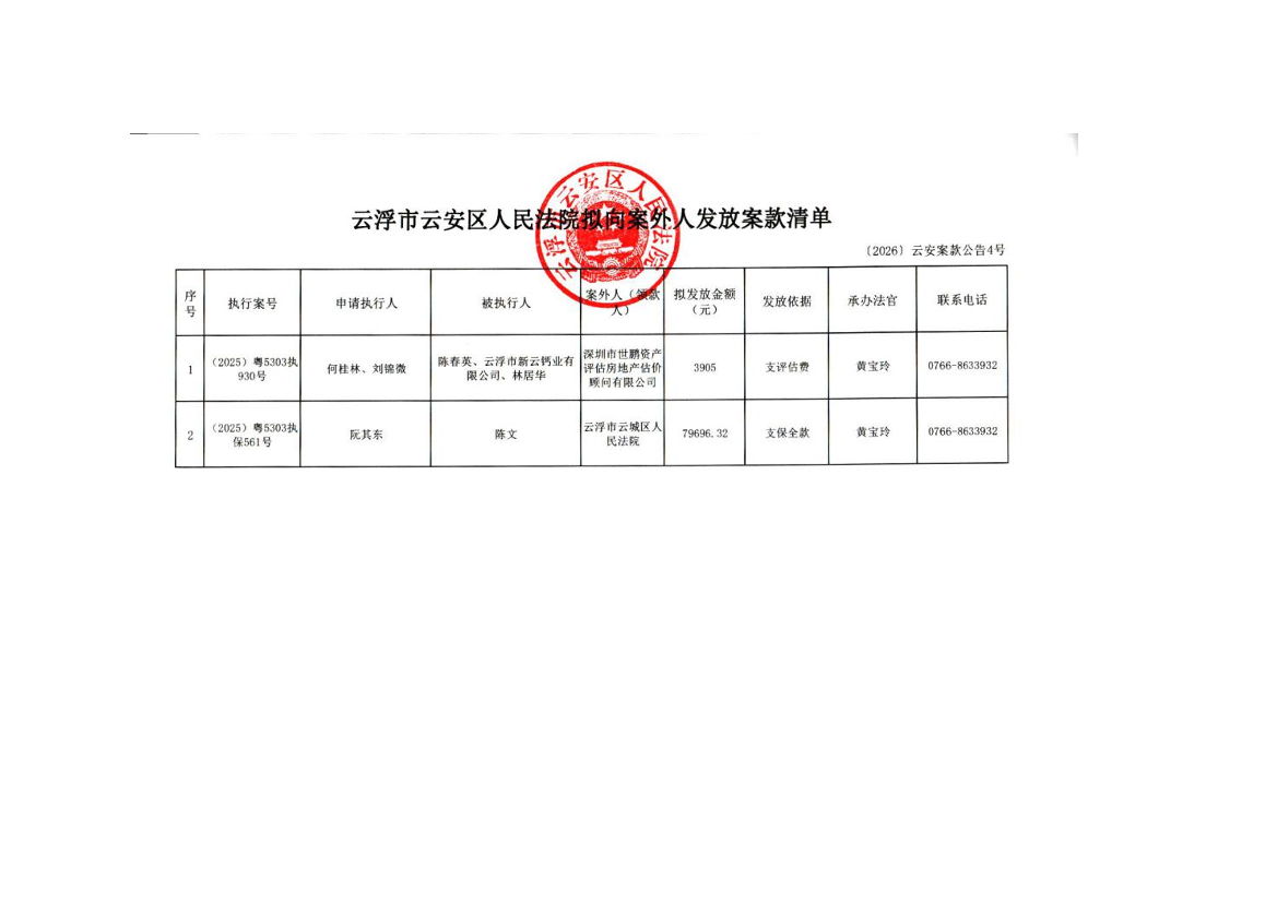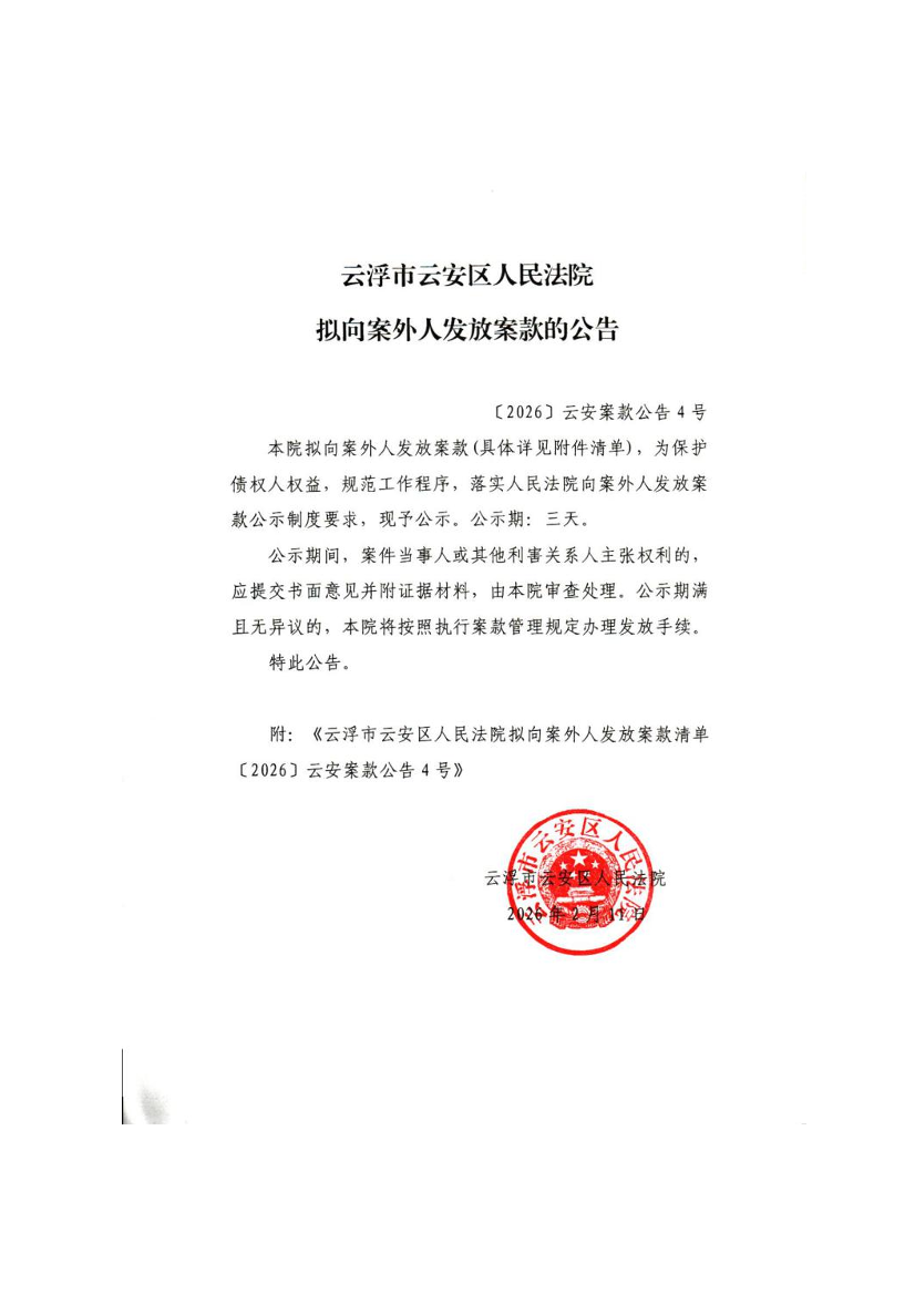 云浮市云安区人民法院拟向案外人发放案款的公告〔2026〕云安案款公告4号