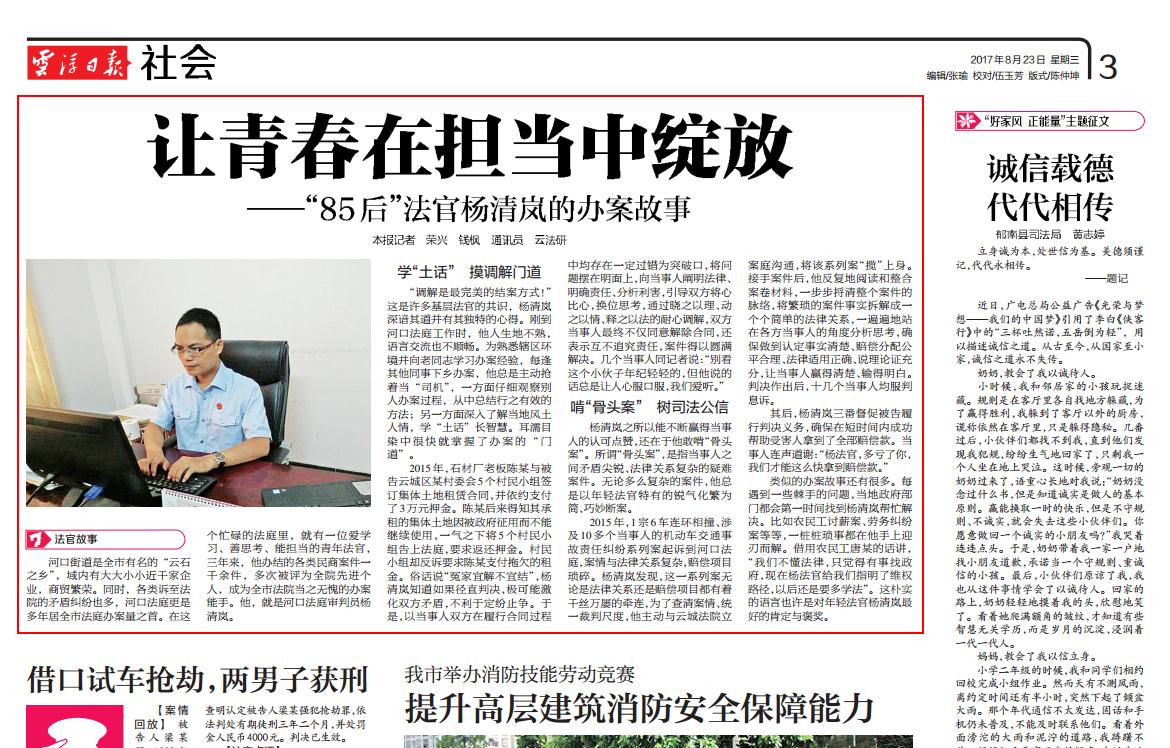 《云浮日报》刊登云城区法院河口法庭审判员杨清岚事迹