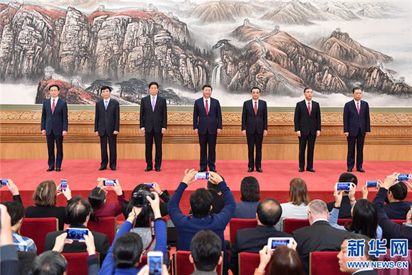 习近平向大家介绍了中共中央政治局常务委员会的其他成员后,代表新一届中共中央领导成员衷心感谢全党同志的信任,表示一定恪尽职守、勤勉工作、不辱使命、不负重托。