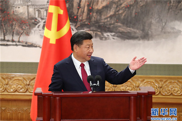 10月25日,刚刚在中国共产党第十九届中央委员会第一次全体会议上当选的中共中央总书记习近平和中共中央政治局常委李克强、栗战书、汪洋、王沪宁、赵乐际、韩正在人民大会堂同采访十九大的中外记者亲切见面。这是习近平发表重要讲话。新华社记者谢环驰 摄