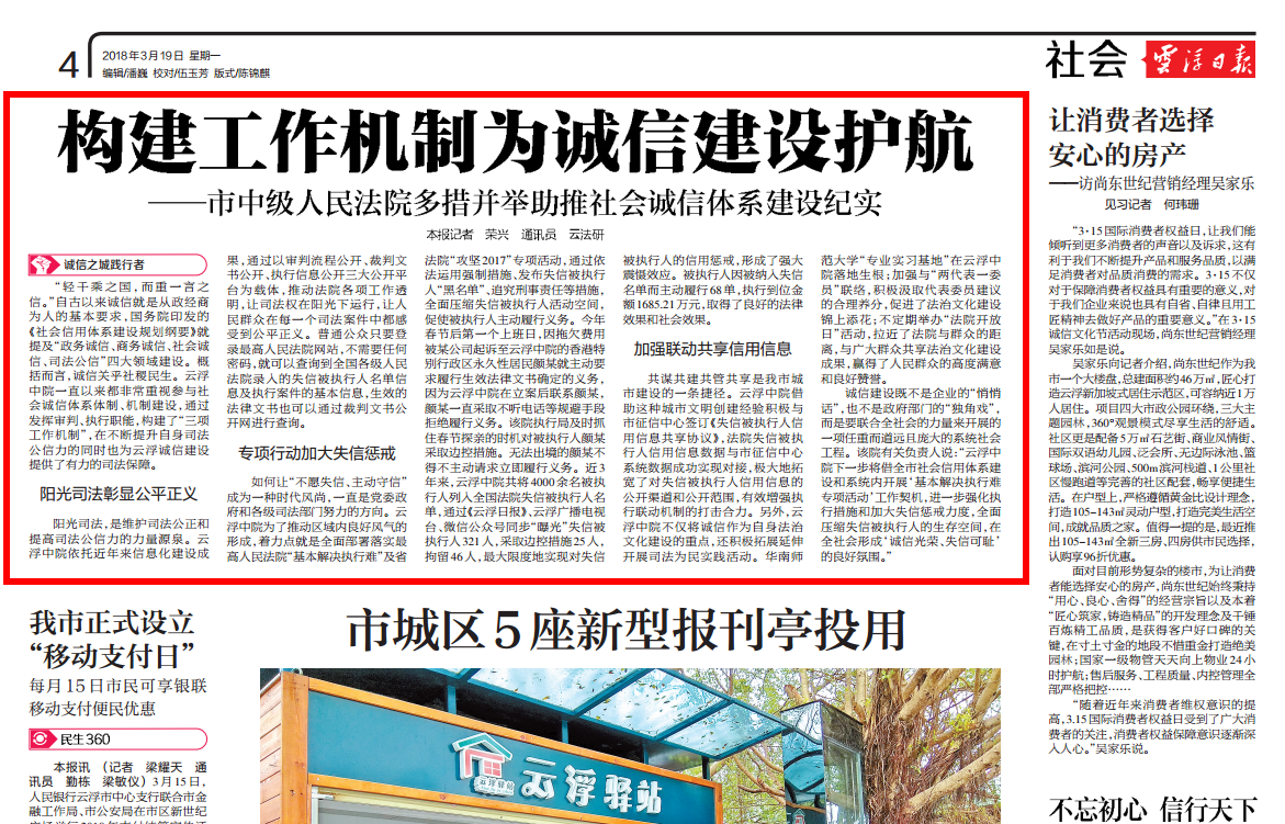 “轻千乘之国,而重一言之信。”自古以来诚信就是从政经商为人的基本要求,国务院印发的《社会信用体系建设规划纲要》就提及“政务诚信、商务诚信、社会诚信、司法公信”四大领域建设。概括而言,诚信关乎社稷民生。云浮中院一直以来都非常重视参与社会诚信体系体制、机制建设,通过发挥审判、执行职能,构建了“三项工作机制”,在不断提升自身司法公信力的同时也为云浮诚信建设提供了有力的司法保障。