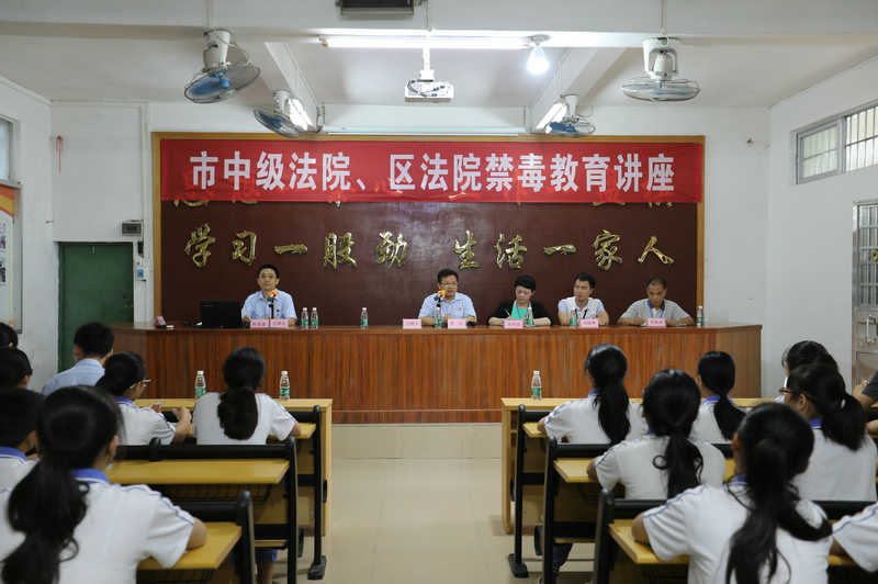 为积极贯彻落实市禁毒委成员单位的工作职责,提高全民禁毒意识,市中院作为云浮市“全民禁毒工程”中河口中学的对口帮扶单位,6月7日,我院刑一庭、刑二庭联合云城区人民法院刑庭到河口中学开展禁毒教育讲座,以及邀请河口中学学生参与区法院一宗毒品案件庭审旁听活动。我院刑二庭庭长罗杰、刑一庭副庭长焦录强,以及云城区法院刑庭陈嘉文法官出席讲座并授课,河口中学部分校领导和约140名学生参与了本次活动。