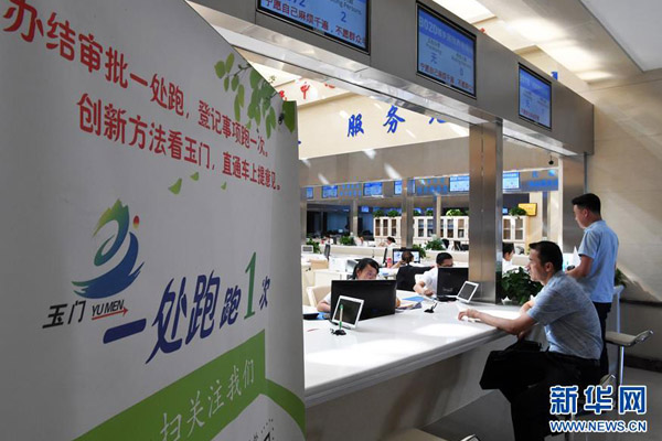 市民在甘肃省玉门市民中心服务大厅窗口办理业务(2018年8月17日摄)。2017年以来,甘肃省玉门市不断深化“放管服”改革,推行“一窗办一网办简化办马上办”,将当地各部门所有行政审批和公共服务事项向市民中心服务大厅集中,在网络上向电子政务平台集中。新华社记者范培珅 摄
