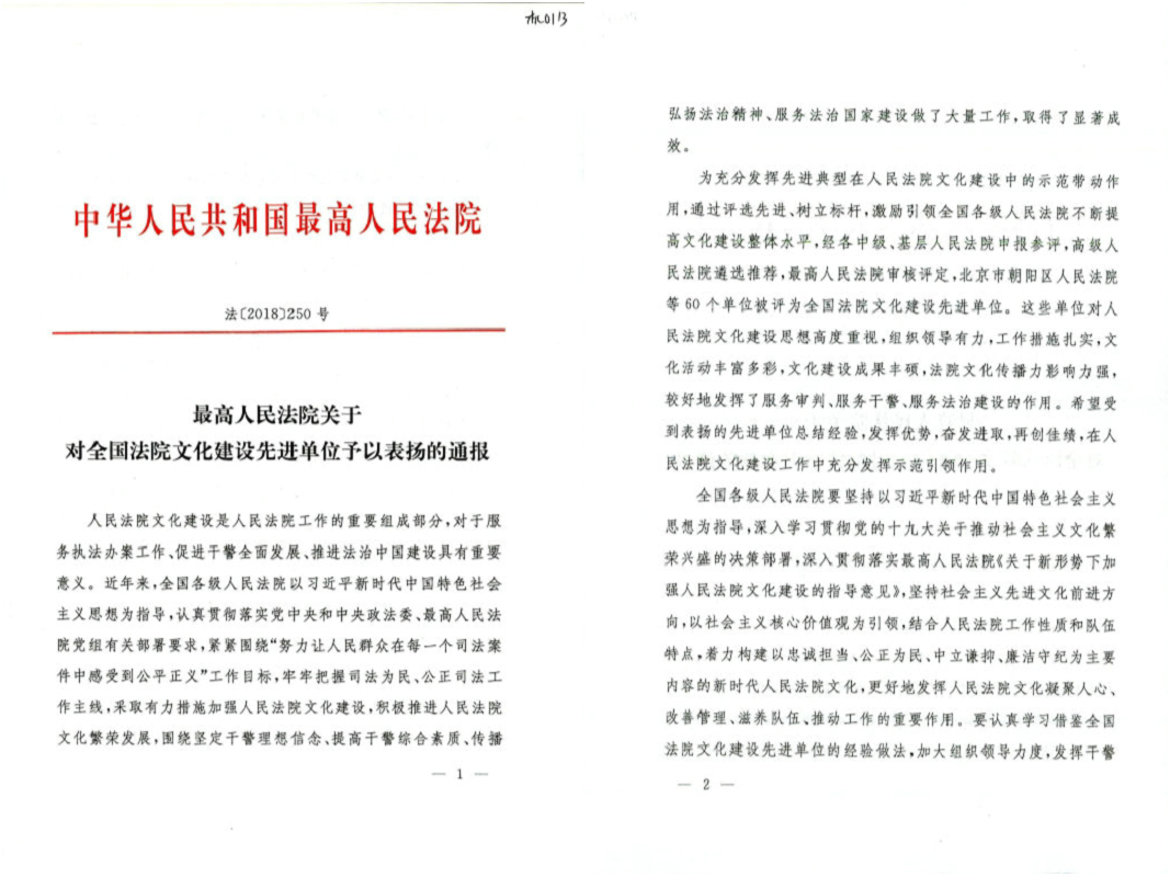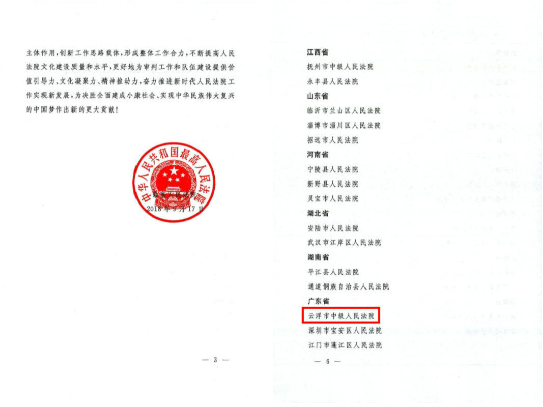 近日,最高人民法院下发了《关于对全国法院文化建设先进单位予以表扬的通报》(法〔2018250号),经高级法院遴选推荐、最高法院审核评定,云浮市中级人民法院被评为全国法院文化建设先进单位,并受到最高法院通报表扬,是广东省获此荣誉的3家法院之一。全国各级法院共有60个单位被评为全国法院文化建设先进单位。