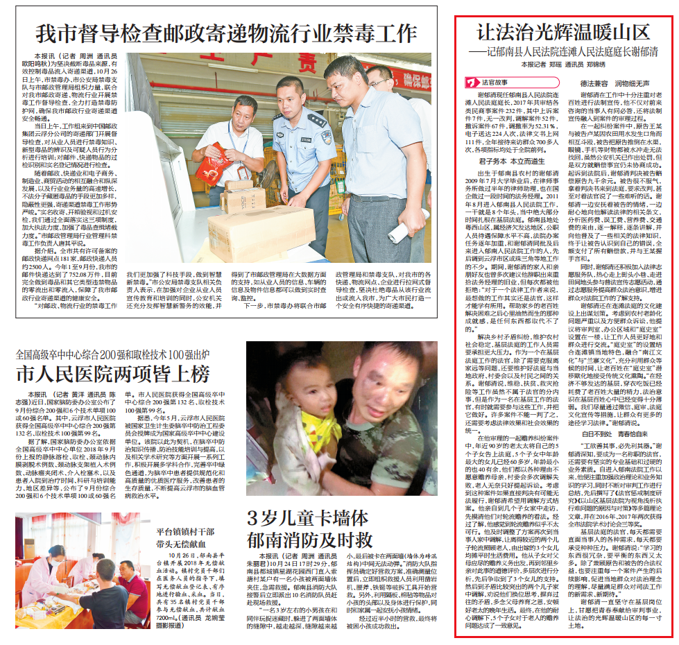 1029日,《云浮日报》第3版刊登了郁南法院干警谢郁清同志的先进事迹文章《让法治光辉温暖山区——记郁南县人民法院连滩人民法庭庭长谢郁清》。