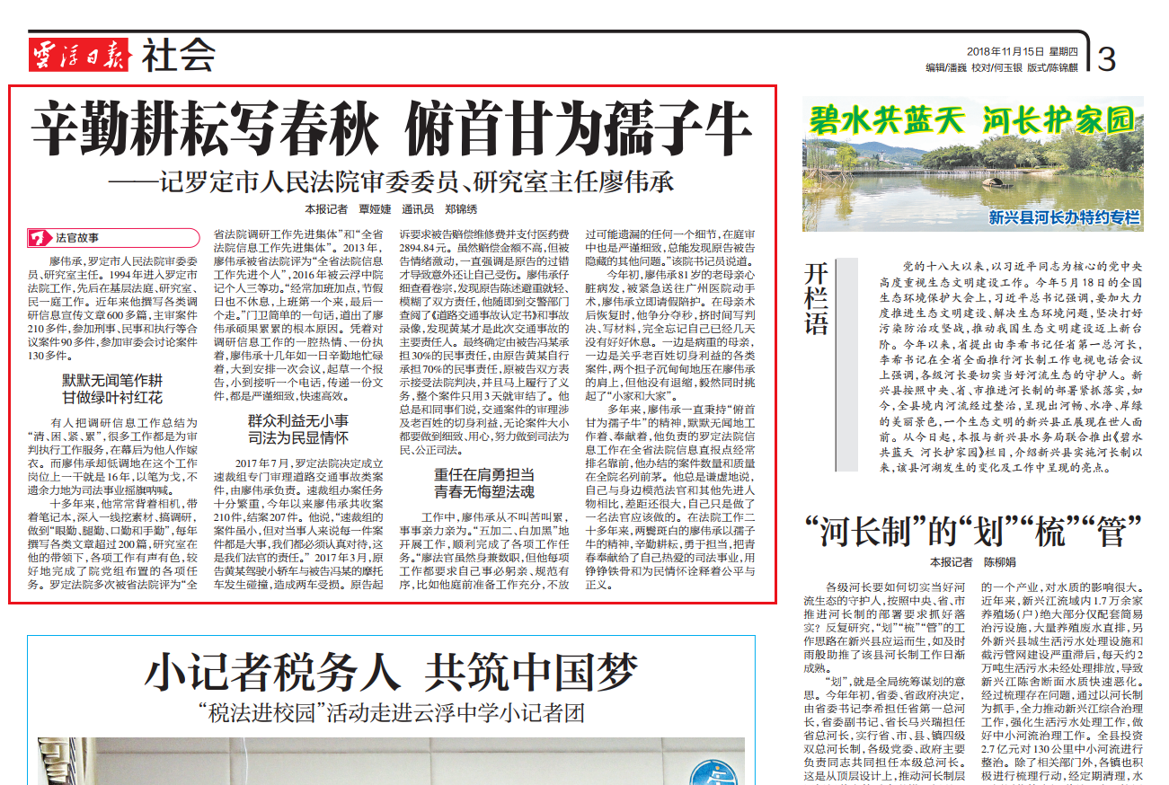 11月15日,《云浮日报》第3版刊登了罗定法院干警廖伟承同志的先进事迹文章《辛勤耕耘写春秋 俯首甘为孺子牛——记罗定市人民法院审委委员、研究室主任廖伟承》。