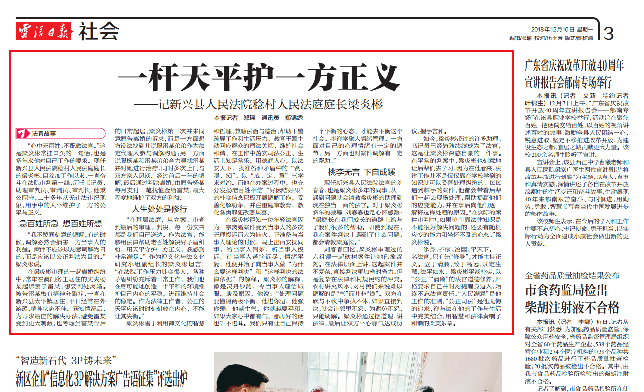 12月10日,《云浮日报》第3版刊登了新兴法院干警梁炎彬同志的先进事迹文章《一杆天平护一方正义——记新兴县人民法院稔村人民法庭庭长梁炎彬》。