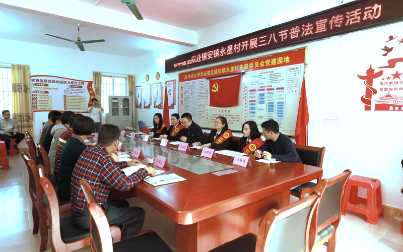 为迎接三八妇女节,充分发挥女法官参与法治社会建设的作用,3月4日上午,市中级法院青年法官法律服务志愿队组织女法官代表到云安区镇安镇永星村委会开展三八节普法宣传活动,为村民普及婚姻家庭、邻里纠纷化解等法律问题,现场宣传扫黑除恶、女性权益保护等专项工作。